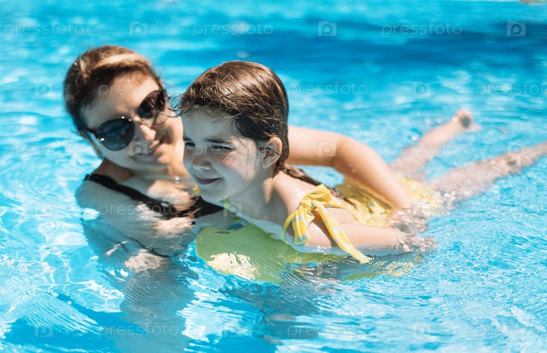 Молодая женщина в солнечных очках учит свою маленькую дочь плавать. Привлекательная мама и ее милая девочка плавают в бассейне