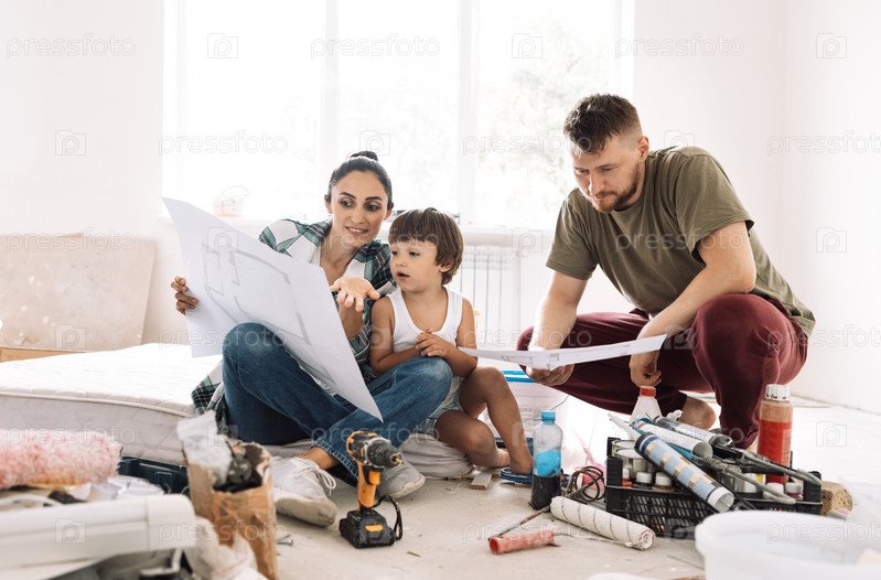 Женщина с мужем и ребенком сидят на матрасе среди строительных материалов