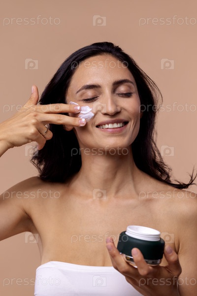 Крупным планом портрет студии красоты привлекательной молодой женщины, наносящей увлажняющий крем на лицо на бежевом изолированном фоне