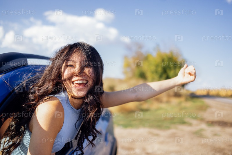 Молодой азиат высовывается из окна машины и смеется. Улыбающаяся кореянка путешествует и развлекается в дороге