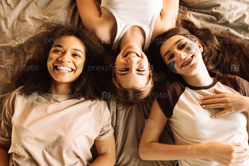 Милые подростки разных рас наносят на лица косметические маски в спальне. Многонациональные друзья лежат на кровати и вместе веселятся дома