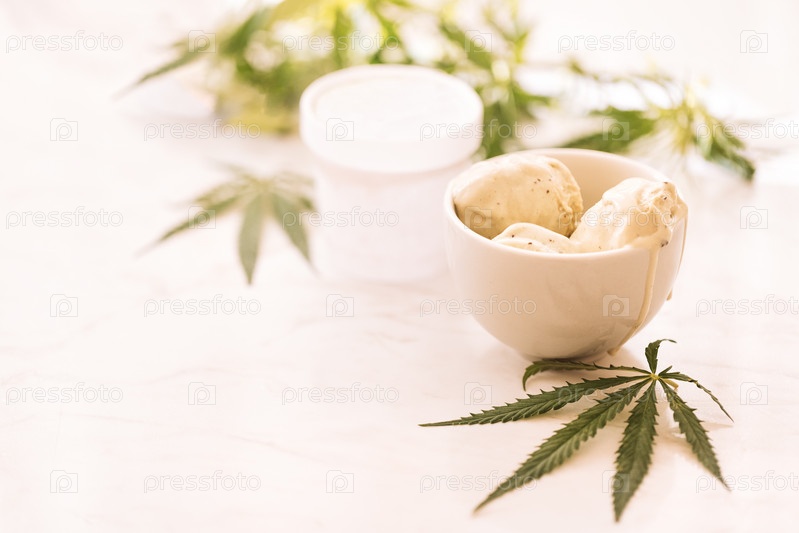 Лист конопли лежит на макетных банках с мороженым на белом мраморном столе