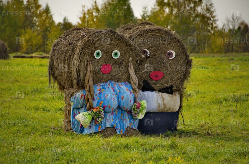 Никольское. Россия. 07 октября 2018 г. Скульптуры крестьян из тюков скошенного сена, установленные в честь успешного завершения сенокосного сезона на берегу Кубенского озера