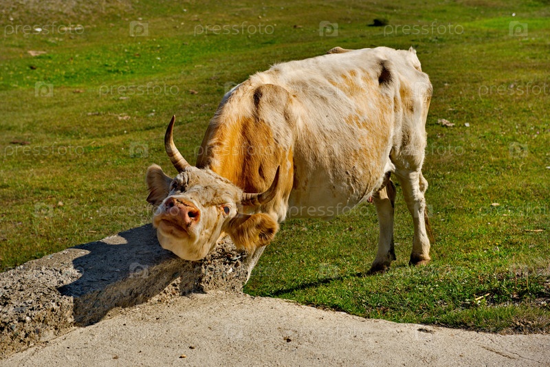 Россия. Горный Алтай. Рогатая корова чешет шею о бетонный выступ на входе в магазин