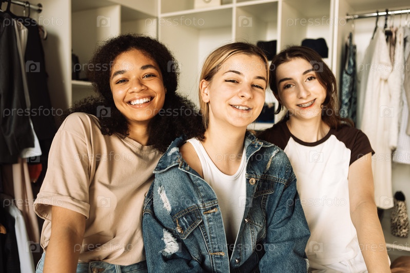 Крупный план трех симпатичных девушек разных рас и национальностей в гримерке дома. Привлекательные студентки делают покупки в магазине
