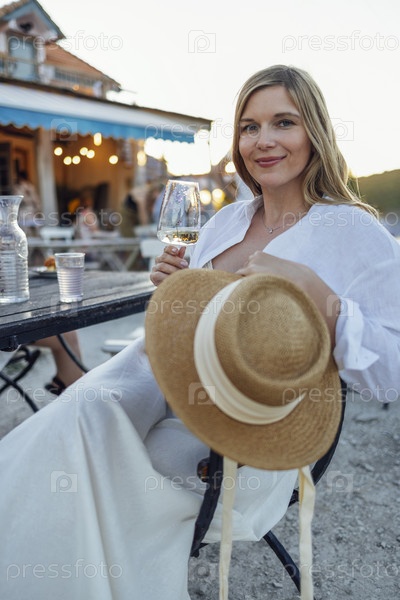 Очаровательная блондинка в легкой одежде и соломенной шляпе сидит вечером в кафе под открытым небом