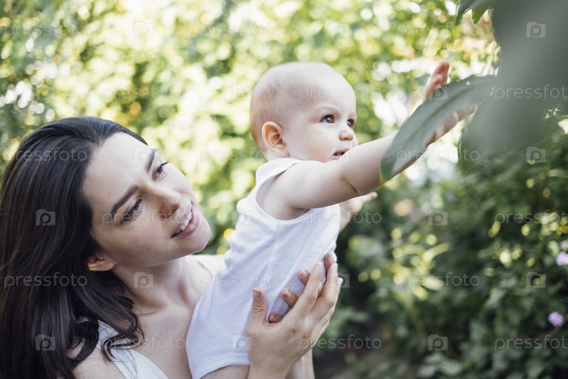 Крупный план женского портрета молодой очаровательной матери, держащей на руках своего милого ребенка в саду