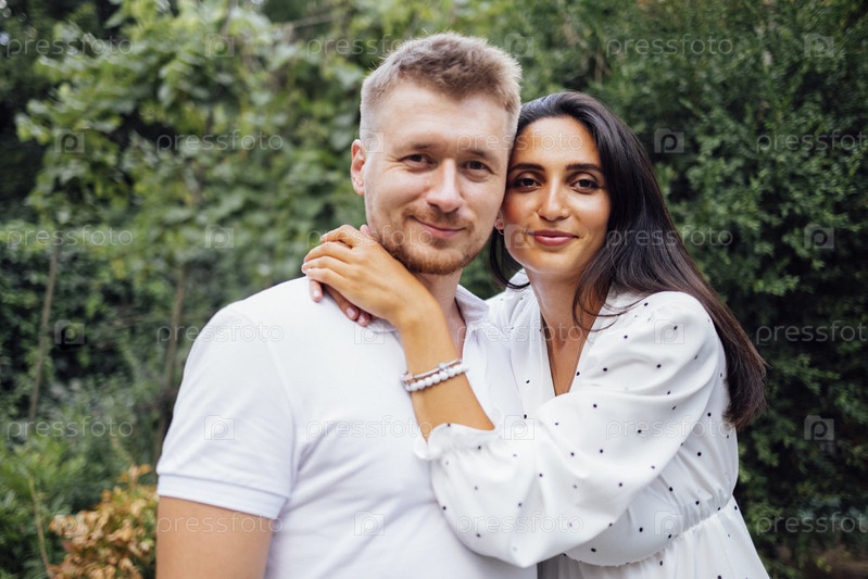 Портрет молодой улыбающейся влюбленной пары на фоне сада или природы