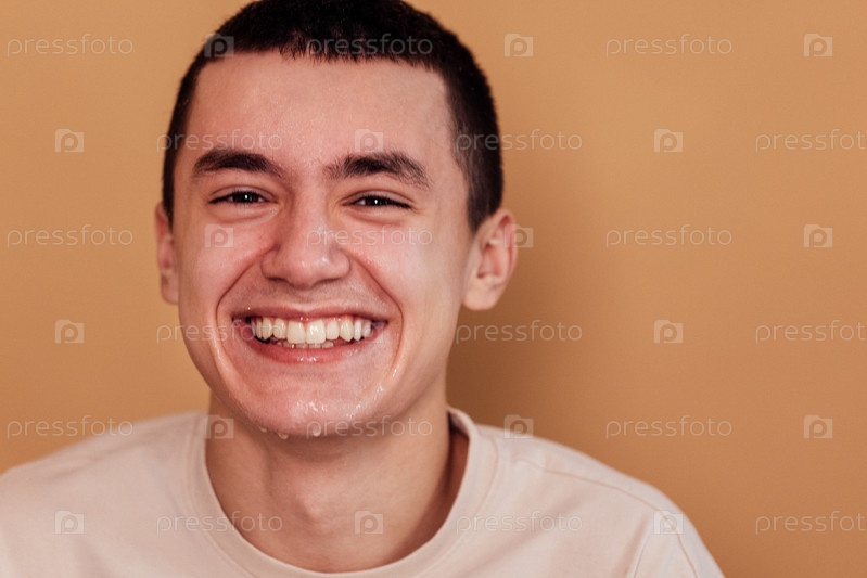 Портрет молодого человека стоит у светлой стены и умывается утром
