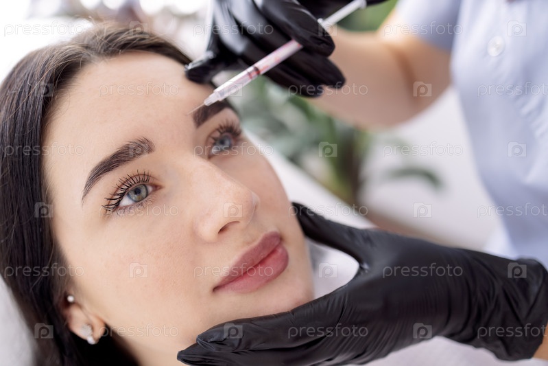 Инъекции красоты. Женщина-косметолог в черных перчатках делает инъекцию