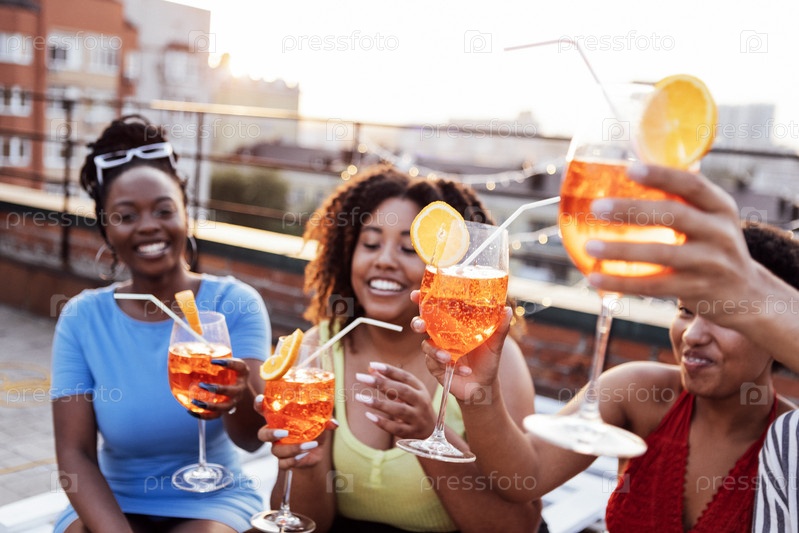 Компания из четырех веселых друзей наслаждается вкусными коктейлями. Вечеринка на крыше