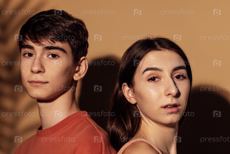 Крупным планом портрет улыбающейся девушки с брекетами и мальчика в нежных объятиях