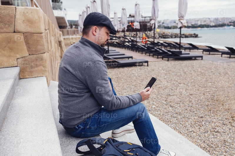 Молодой человек в теплой повседневной одежде сидит на ступеньках перед песчаным пляжем и держит телефон