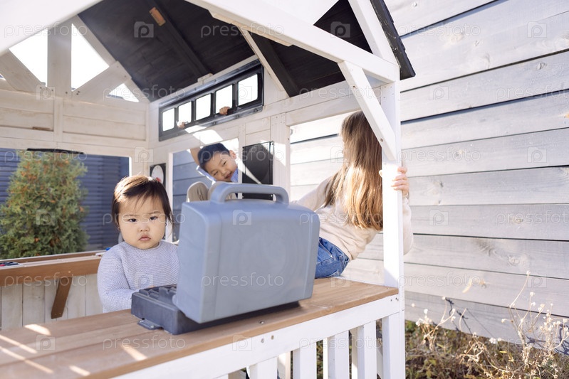 Трое маленьких детей играют в деревянном детском домике