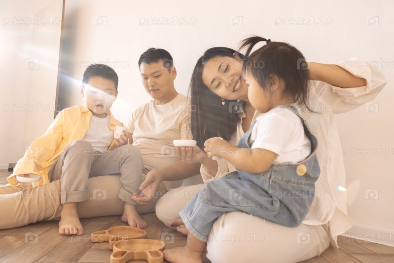 Счастливая азиатская семья. Корейские родители и их милые маленькие дети играют дома с игрушками