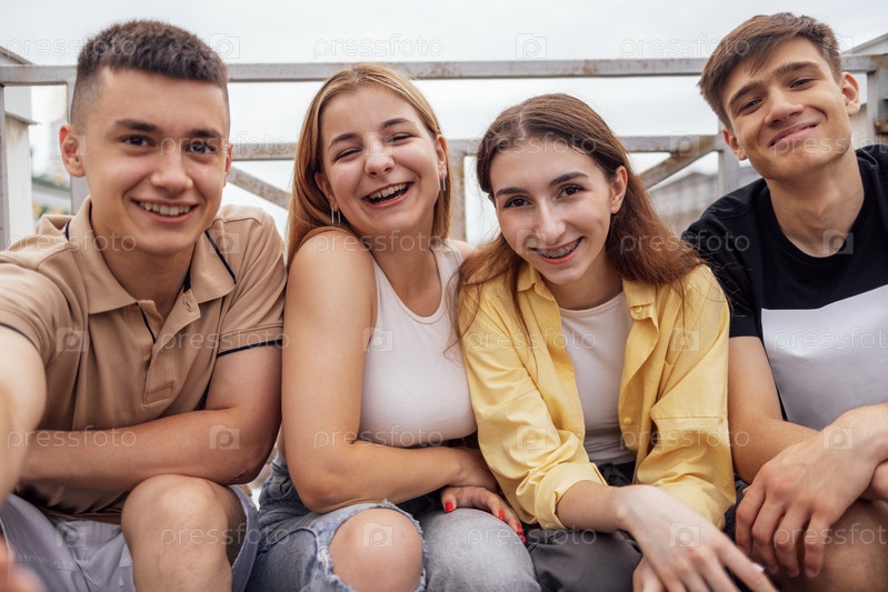 Четыре симпатичных подростка делают селфи. Забавные друзья фотографируются на телефон на улице. Улыбающиеся мальчики и девочки сидят на улице