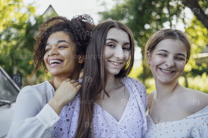 Три симпатичные многорасовые подростки в белых элегантных платьях обнимаются и смеются