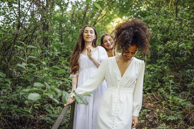 Три счастливые симпатичные улыбающиеся девочки-подростки в белых летних элегантных платьях идут по тропинке в лесу или парке