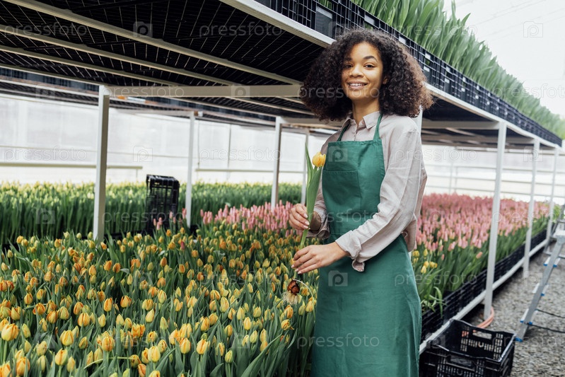 Женские руки африканской девушки в зеленом фартуке, держащей тюльпан на фоне теплицы