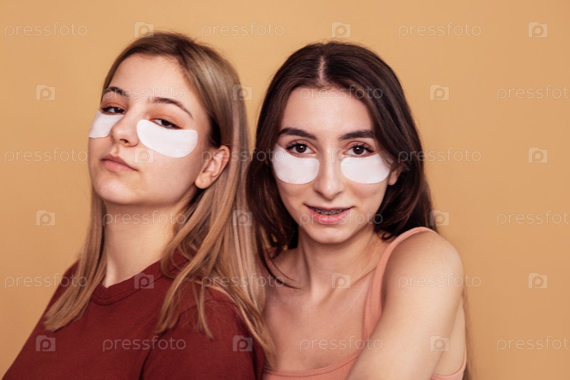Две очаровательные девушки-подростки с увлажняющими патчами под глазами. Милые девушки ухаживают за кожей лица. Гигиена и уход за кожей в подростковом возрасте. Рутина красоты