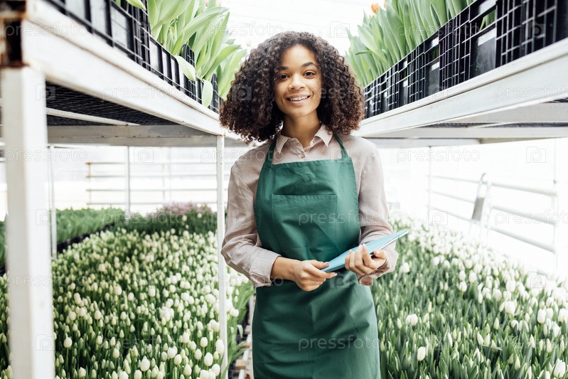 Молодая улыбающаяся женщина смешанной расы использует цифровой планшет для выращивания тюльпанов разных типов