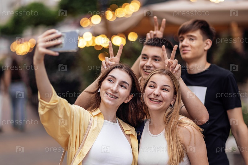 Четыре симпатичных подростка делают селфи. Забавные друзья фотографируют себя
