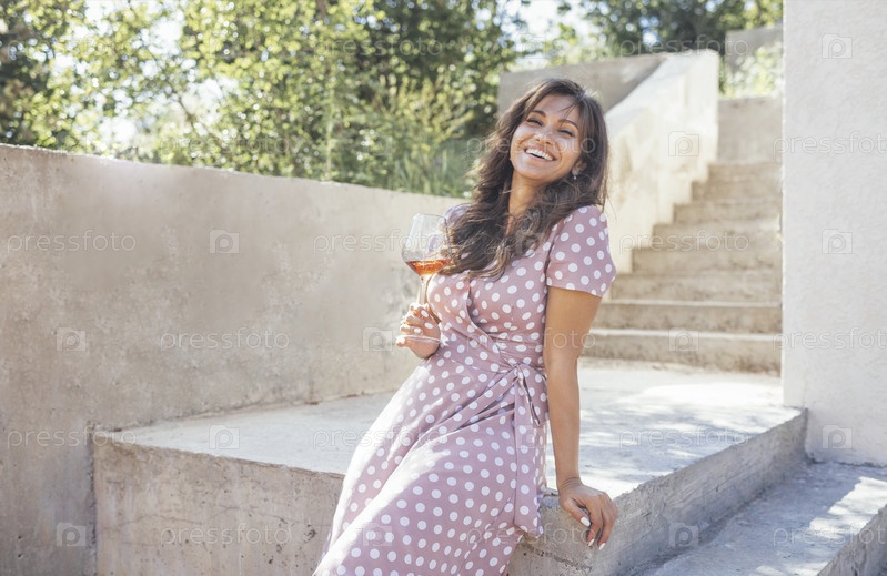 Красивая молодая женщина смешанной расы в розовом платье улыбается и держит бокал шампанского