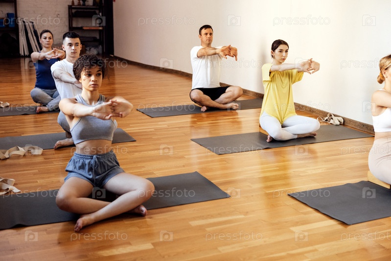 Спортивные люди разных возрастов и рас занимаются асанами йоги с тренером. Молодые многонациональные спортивные женщины и мужчины сидят, скрестив ноги, на ковриках, смотрят на тренера и растягиваются в тренажерном зале