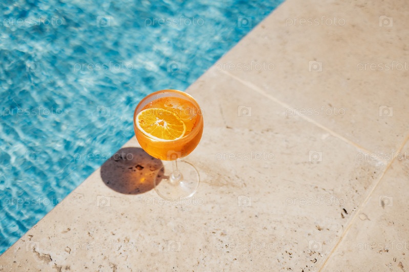Стакан спритца-аперола с ломтиком апельсина у бассейна в курортном отеле во время отпуска