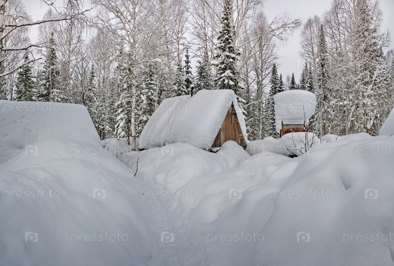 Россия. Кузнецкий Алатау. Зимний вид на дачный поселок Борисовка среди заснеженной непроходимой тайги на берегу реки Томь