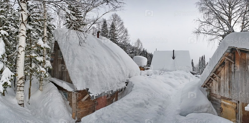 Россия. Кузнецкий Алатау. Зимний вид на дачный поселок Борисовка среди заснеженной непроходимой тайги на берегу реки Томь