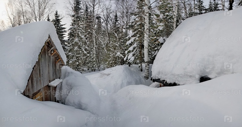 Россия. Кузнецкий Алатау. Зимний вид на дачный поселок Борисовка среди заснеженной непроходимой тайги на берегу реки Томь
