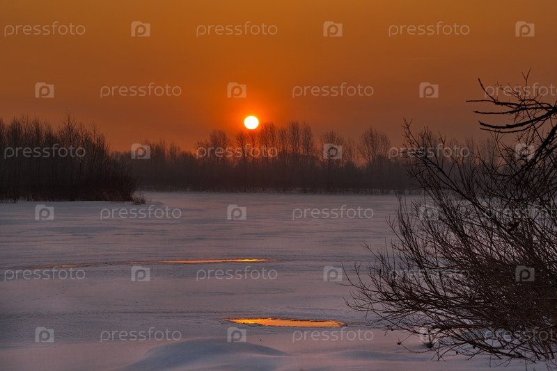 Новокузнецк, Россия. Юг Западной Сибири. Восходящее солнце над закованной зимним льдом рекой Кондома