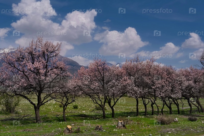 Киргизия. Вид на цветущие деревья абрикосов на пустынных холмах вдоль автотрассы Бишкек - озеро Иссык-Куль