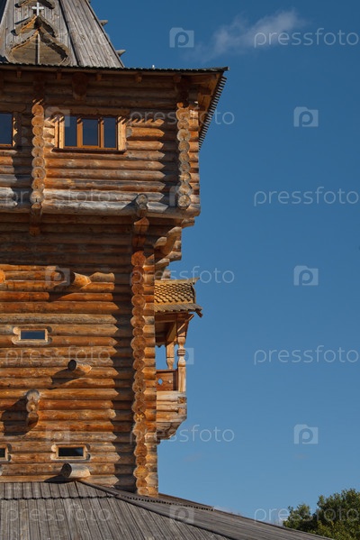 Московская область. Россия. 27 сентября 2023 года. Фрагменты православных церквей, изготовленных из деревянного бруса в историческом комплексе Гремячий Ключ