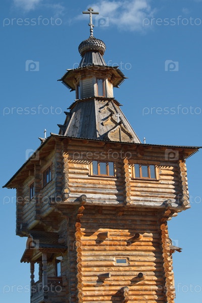 Московская область. Россия. 27 сентября 2023 года. Фрагменты православных церквей, изготовленных из деревянного бруса в историческом комплексе Гремячий Ключ