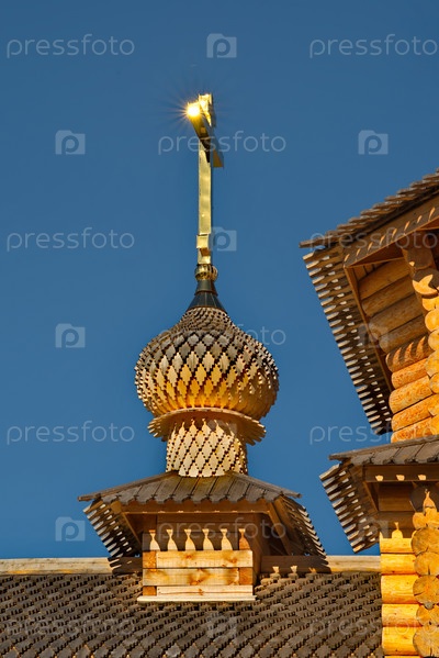 Московская область. Россия. 27 сентября 2023 года. Фрагменты православных церквей, изготовленных из деревянного бруса в историческом комплексе Гремячий Ключ