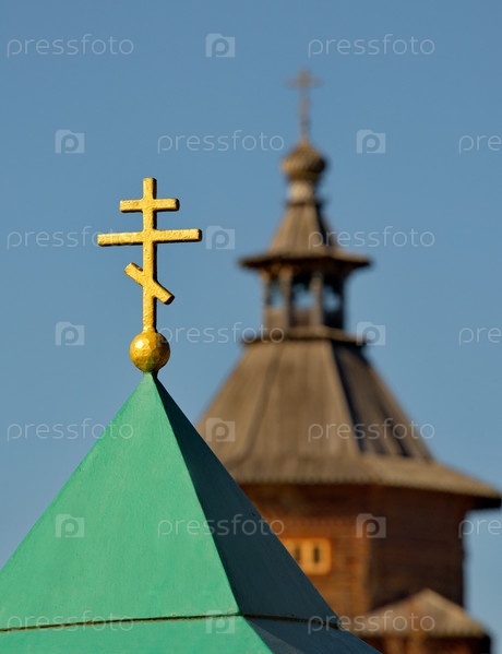 Московская область. Россия. 27 сентября 2023 года. Фрагменты православных церквей, изготовленных из деревянного бруса в историческом комплексе Гремячий Ключ