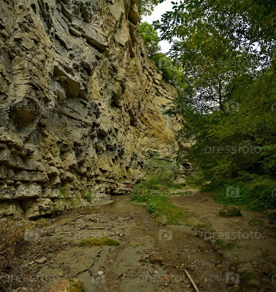 Россия, Северный Кавказ. Вид на тенистые замшелые скалы возле водопада Адаи-Су (девичья коса) в Чегемском ущелье Кабардино-Балкарии