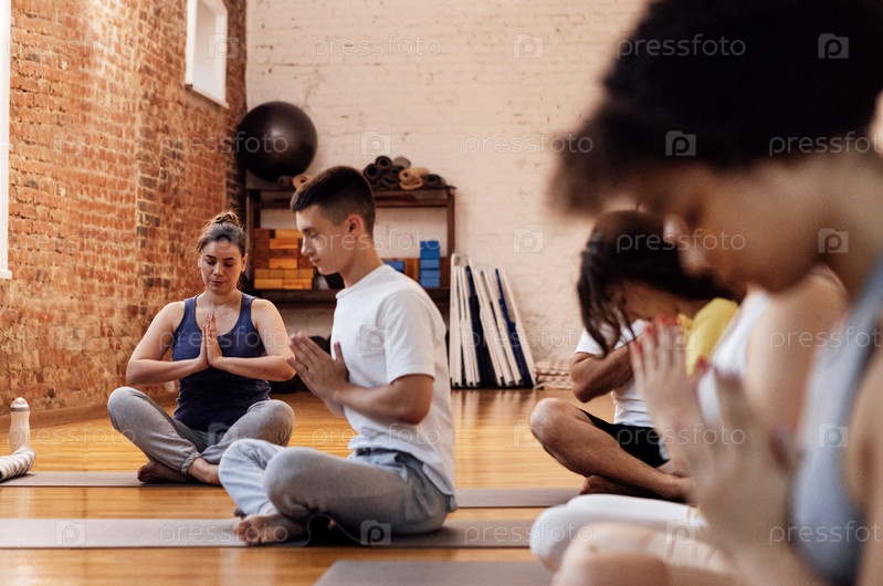 Группа многонациональных спортсменов сидит на ковриках и медитирует. Окончание занятий фитнесом и расслабленные люди в спортивной одежде в позе лотоса в спортзале