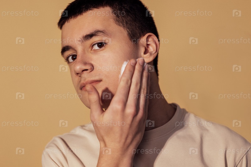 Портрет крупным планом подростка, наносящего пену для бритья на щеку. Подросток готовится побрить лицо. Гигиена и уход за кожей в подростковом возрасте