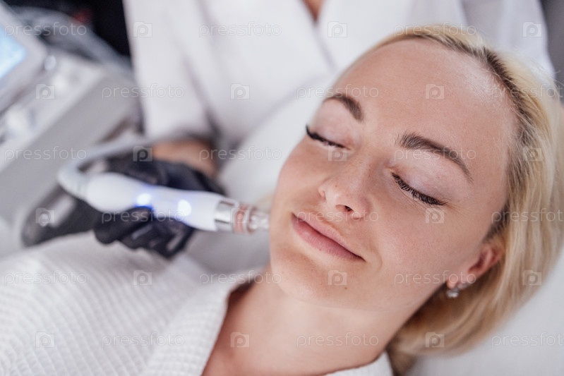 Молодая женщина лежит с закрытыми глазами во время аппаратного увлажнения кожи лица