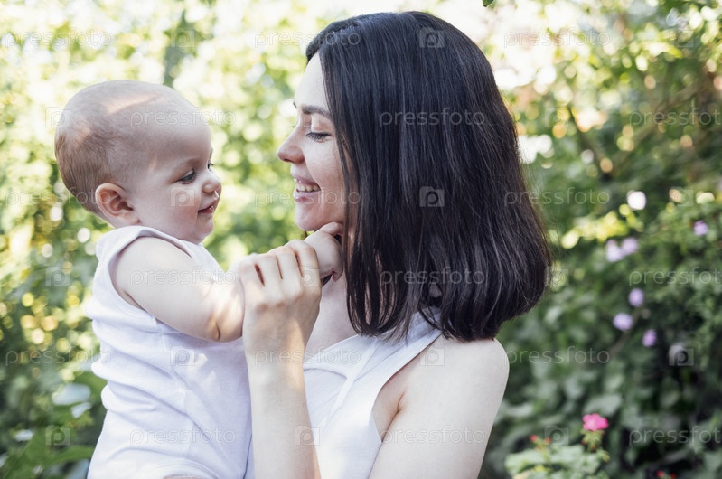 Крупный план женского портрета молодой очаровательной матери, держащей на руках своего милого ребенка в саду