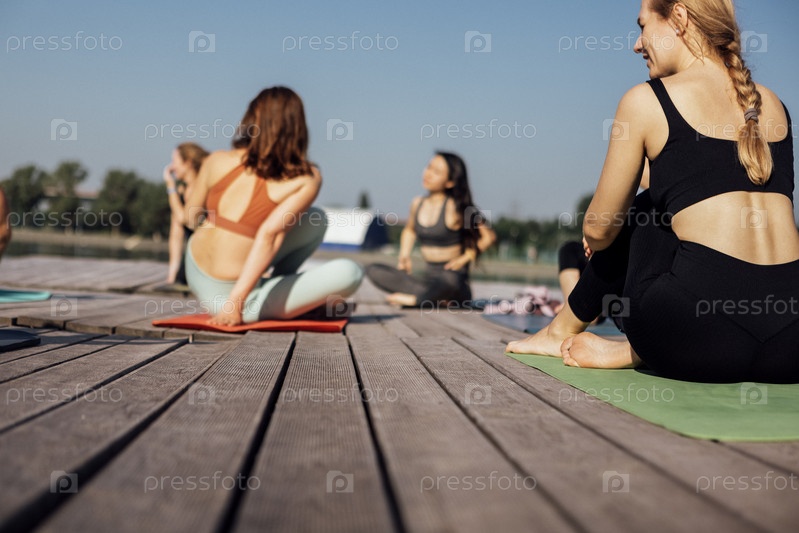 Группа молодых женщин разных национальностей отдыхает после тренировки