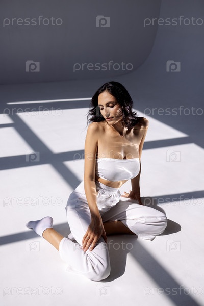 Студийный модный портрет очаровательной молодой женщины, сидящей с закрытыми глазами