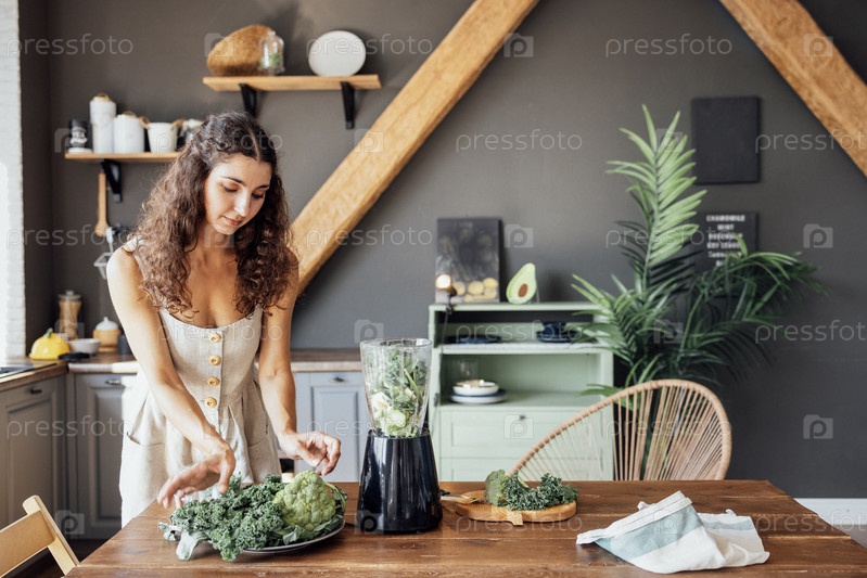 Очаровательная кудрявая брюнетка в льняном сарафане готовит полезный зеленый коктейль в блендере на кухне