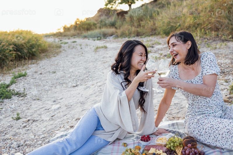 Привлекательные межрасовые молодые женщины в повседневной одежде смеются и пьют вино на пикнике на пляже. Счастливые улыбающиеся девушки произносят тост и чокаются