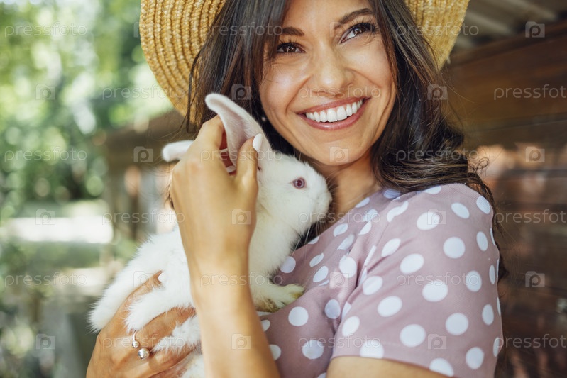 Крупным планом молодая красивая женщина держит маленького белого кролика