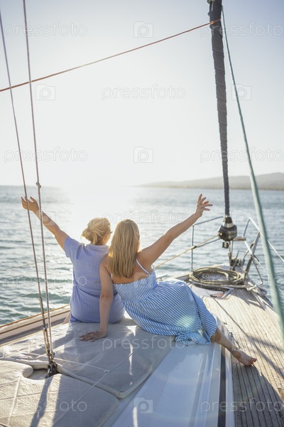 Две молодые блондинки-кавказки встречают восход солнца на яхте