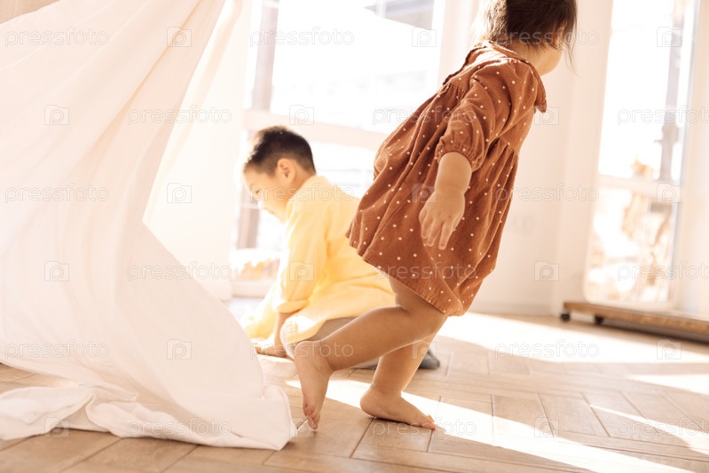 Молодая азиатка играет дома со своими милыми детьми